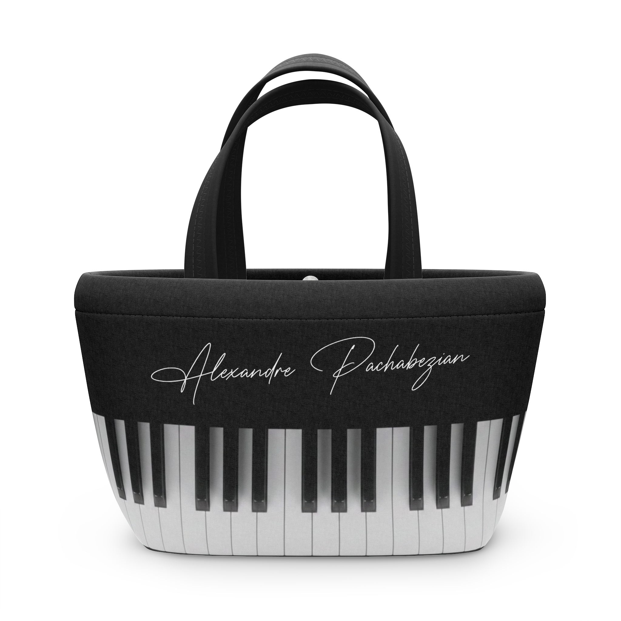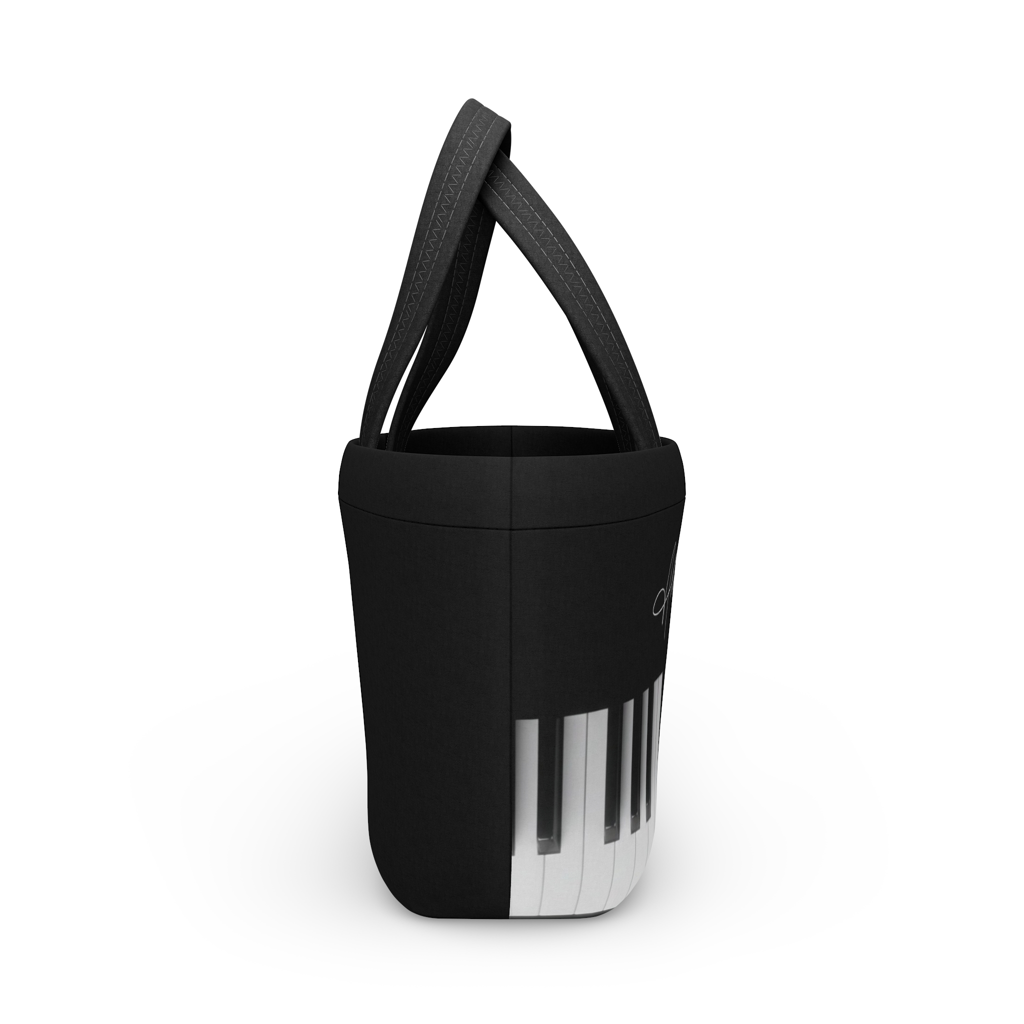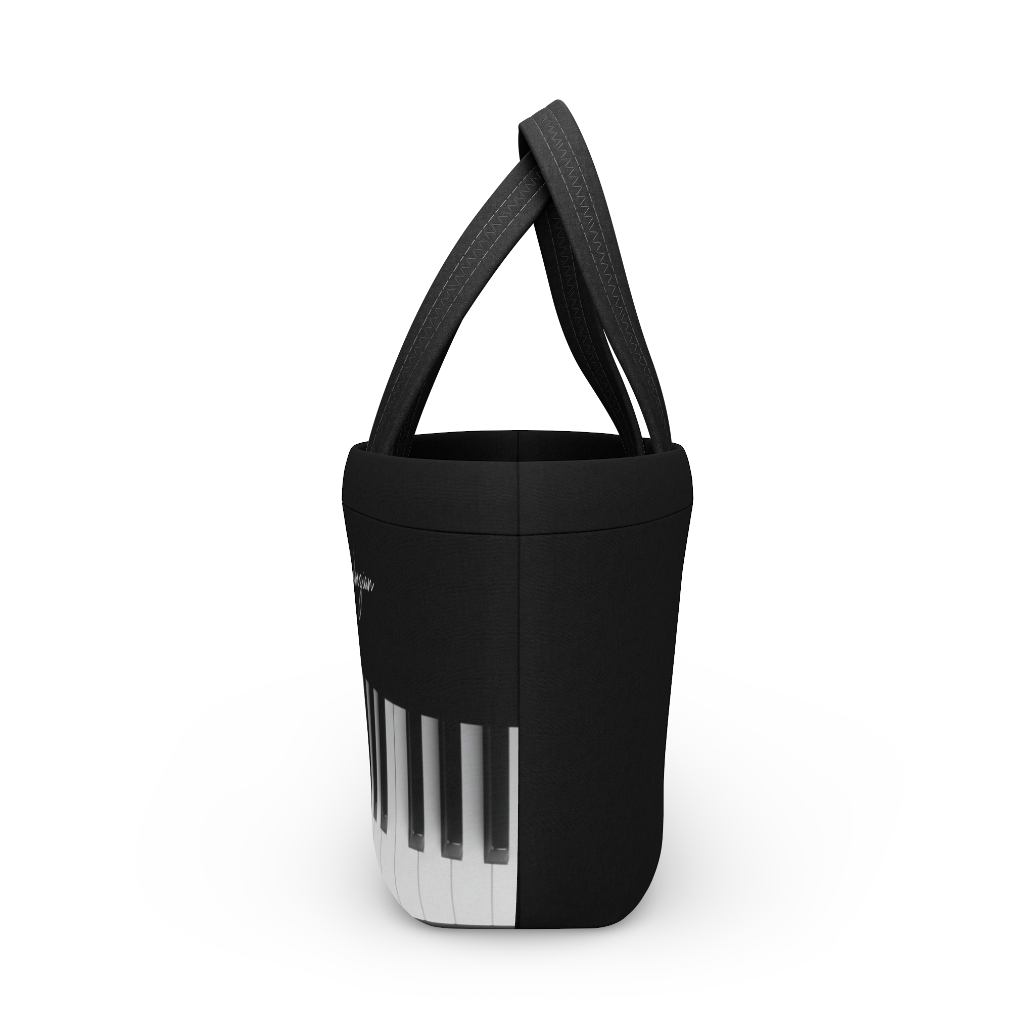 A sleek neoprene lunch bag that doubles as a miniature statement tote for musicians, students, and anyone who carries a midday ritual. The curved, flat-bottom shape keeps containers upright while the spacious single compartment swallows a full lunch box, snack, and a water bottle. Soft, durable double handles make comings-and-goings effortless, and a magnetic button keeps the contents secure without fighting a zipper. The printed piano-key motif and subtle monogram give it quiet, artistic flair — it looks at home beside a keyboard or tucked under a studio chair. Lightweight, wipeable, and striking in black-and-white, this bag makes everyday meals feel thoughtfully styled and intentionally musical.